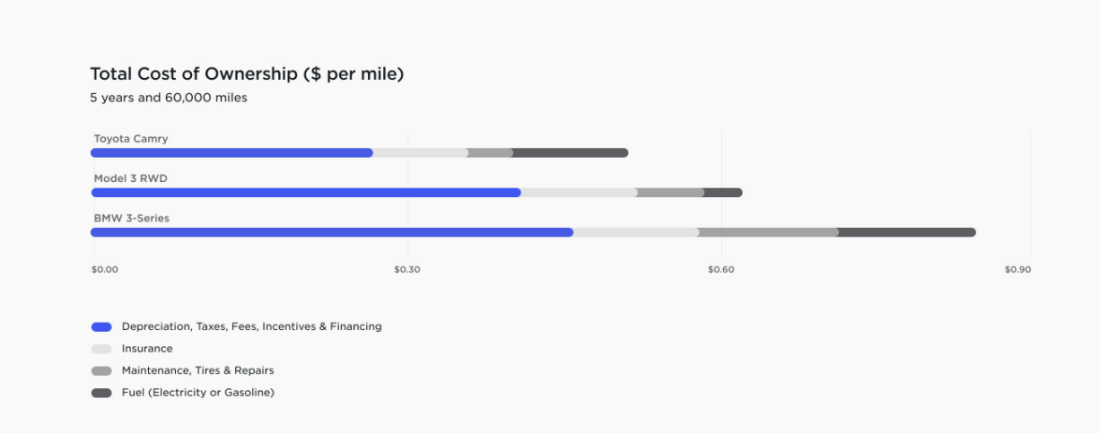 特斯拉对产品高效环保的执着,更让特斯拉车辆有了超低拥车成本,在国际油价普遍上涨的形势下,为众多消费者提供了更为经济的出行选择。特斯拉汽车终身运行成本显著低于同级燃油车,并且在二手车市场保持较高的剩余价值。以特斯拉Model 3为例,虽然Model 3的基本价格与宝马3系相似,但是按照五年6万英里的平均驾驶工况计算,特斯拉每英里的总持有成本远低于宝马3系,几乎只与丰田凯美瑞相当。