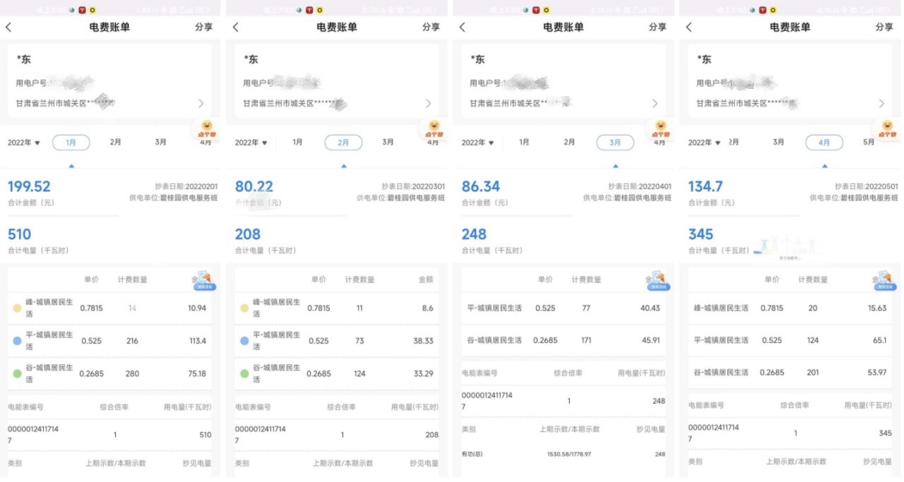 上图为赵先生2021年1-4月家充账单(图片由赵先生提供)